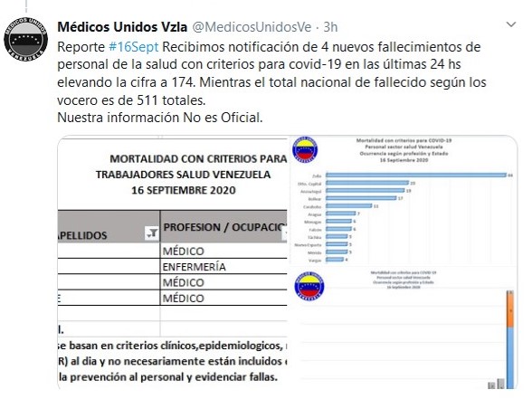 La información, fue publicada a través de la cuenta en la red social twitter de esta Orgaanización No Gubernamental (ONG), en la que se detalla la cifra y los nombres de los médicos fallecidos en las últimas horas.