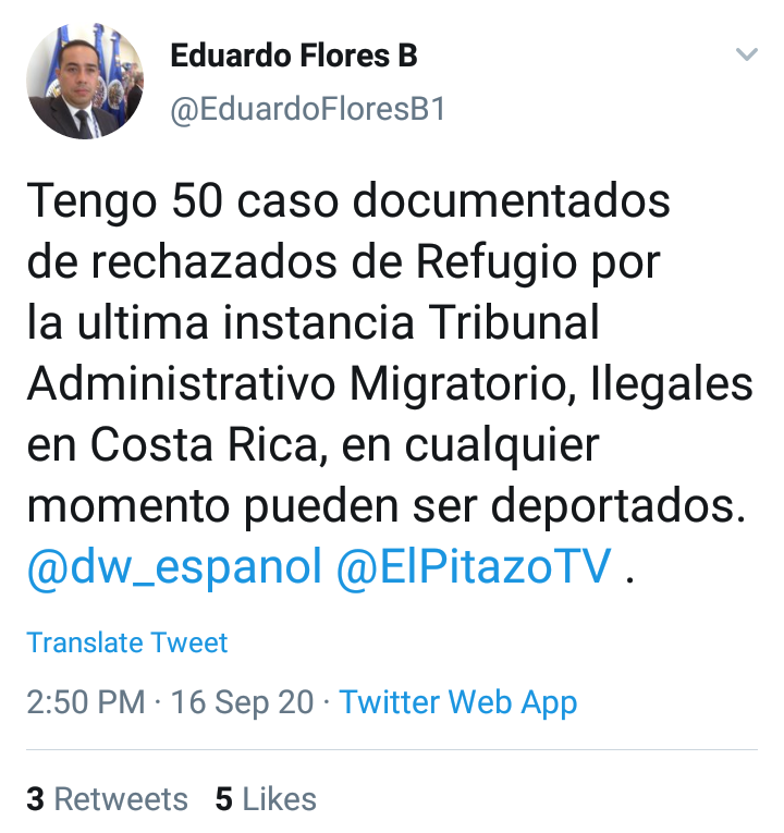 «Con todo respeto @CarlosAlvQ , tengo 50 casos documentados rechazados por el TAM, ilegales en Costa Rica sin ningún estatus migratorio,están sujetos a una deportación en cualquier momento. Hay muchos casos más en la mismas condiciones».