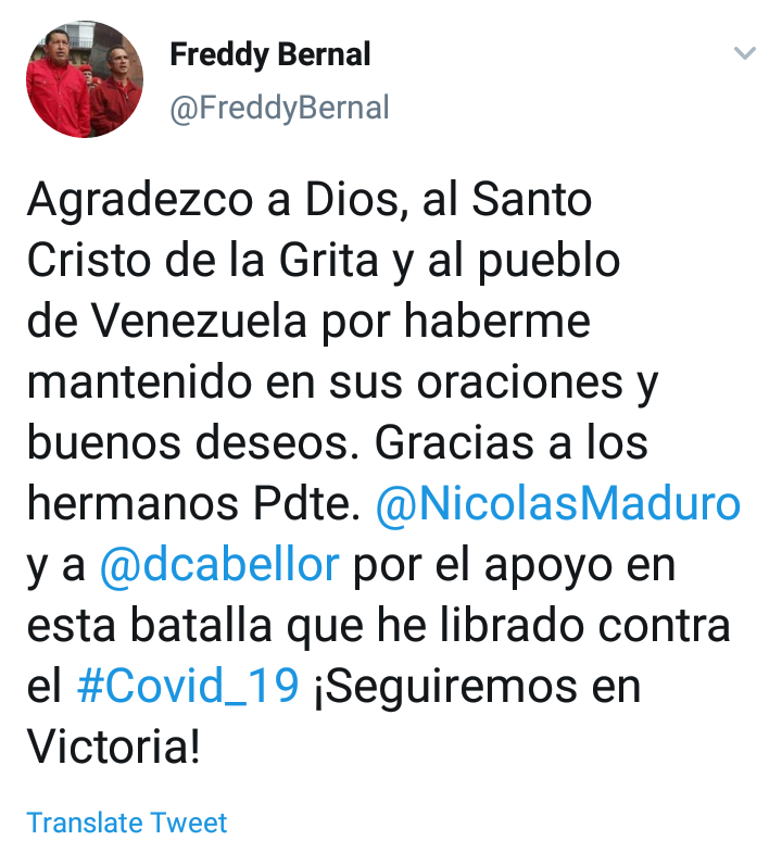 «Agradezco a Dios, al Santo Cristo de la Grita y al pueblo de Venezuela por haberme mantenido en sus oraciones y buenos deseos. Gracias a los hermanos presidente Nicolás Maduro y Diosdado Cabello por el apoyo en esta batalla que he librado contra el Covid-19».