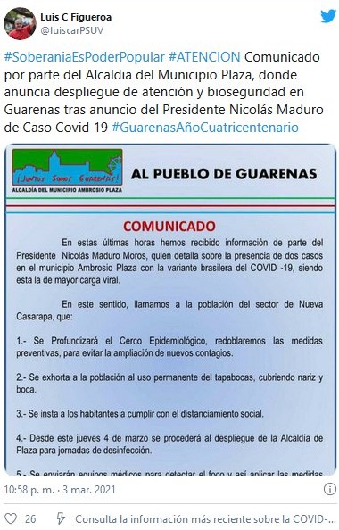 En Nueva Casarapa de Guarenas estado Miranda, un cerco epidemiológico fue activado ante la detección de casos de la variante brasilera del covid-19.