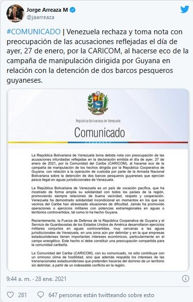 A través de un comunicado en Twitter, el canciller venezolano Jorge Arreaza dio a conocer la preocupación y el rechazo por parte del gobierno venezolano con relación al pronunciamiento de la Comunidad del Caribe (Coricom) ante el caso de Guyana y «sus falsas acusaciones» tras la interceptación de barcos de pesca ilegal en aguas jurisdiccionales venezolanas por la Armada Nacional Bolivariana.