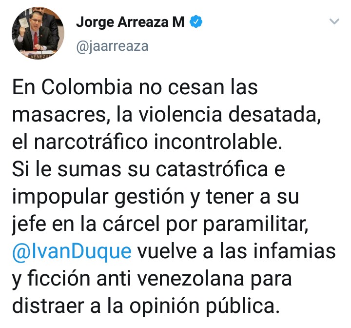 «en Colombia no cesan las masacres, la violencia desatada, el narcotráfico incontrolable. Si le sumas su catastrófica e impopular gestión y tener a su jefe en la cárcel por paramilitar, Iván Duque, vuelve a las infamias y ficción anti venezolana para distraer a la opinión pública».