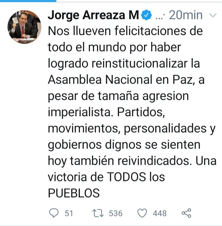 El canciller venezolano Jorge Arreaza, difundió a través de sus redes sociales que el Gobierno Nacional ha recibido un sinfín de felicitaciones de todas partes del mundo por haber instalado la nueva Asamblea Nacional en Venezuela.