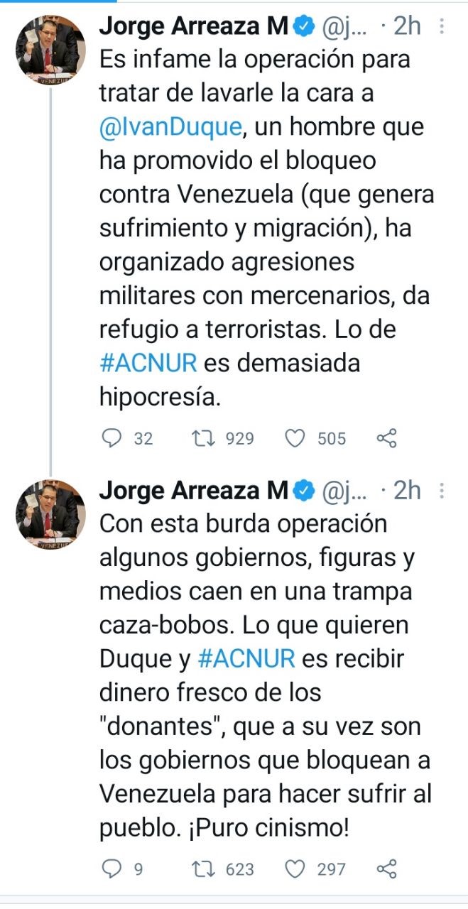 «Con esta burda operación algunos gobiernos, figuras y medios caen en una trampa caza-bobos. Lo que quieren Duque y #ACNUR es recibir dinero fresco de los ‘donantes’, que a su vez son los gobiernos que bloquean a Venezuela para hacer sufrir al pueblo. ¡Puro cinismo!»