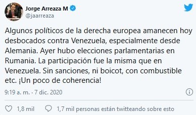 El canciller publicó a traves de su red social Twitter que las elecciones legislativas que fueron celebradas también en el país europeo de Rumania, tuvo la misma participación que las elecciones venezolanas solo que sin sanciones, ni boicot y además con combustible.