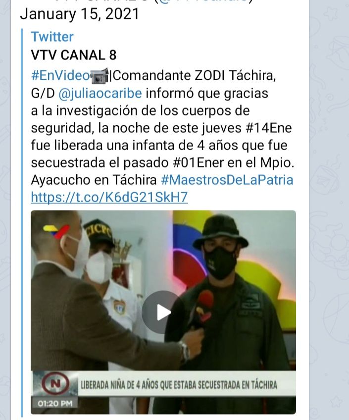 «Fue un arduo trabajo de 15 días, de investigación, de campo, de telefonía» que culminó con la liberación de la infante en horas de la noche de este 14 de enero, en el sector Tucape,del municipio Cárdenas, estado Táchira, indicó el comandante de la ZODI Táchira. Agregó que la niña ya se encuentra con sus padres «sana y salva», luego de recibir la debida atención médica y psicológica.