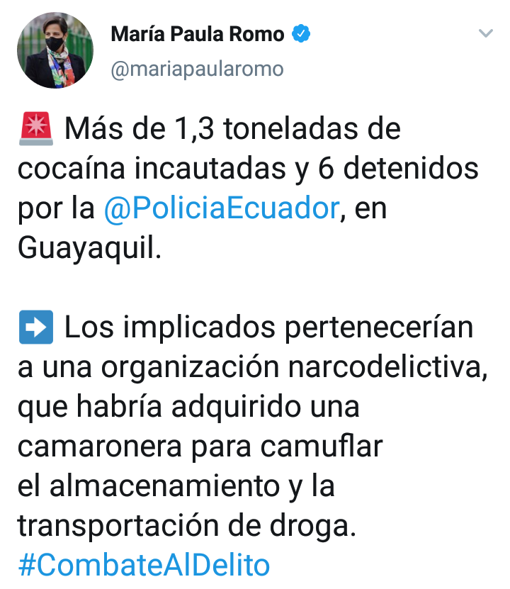 María Paula Romo ministra de gobierno dió a conocer que las autoridades ecuatorianas incautaron más de 1,3 toneladas de cocaína en la ciudad de Guayaquil donde se planificó un operativo.
