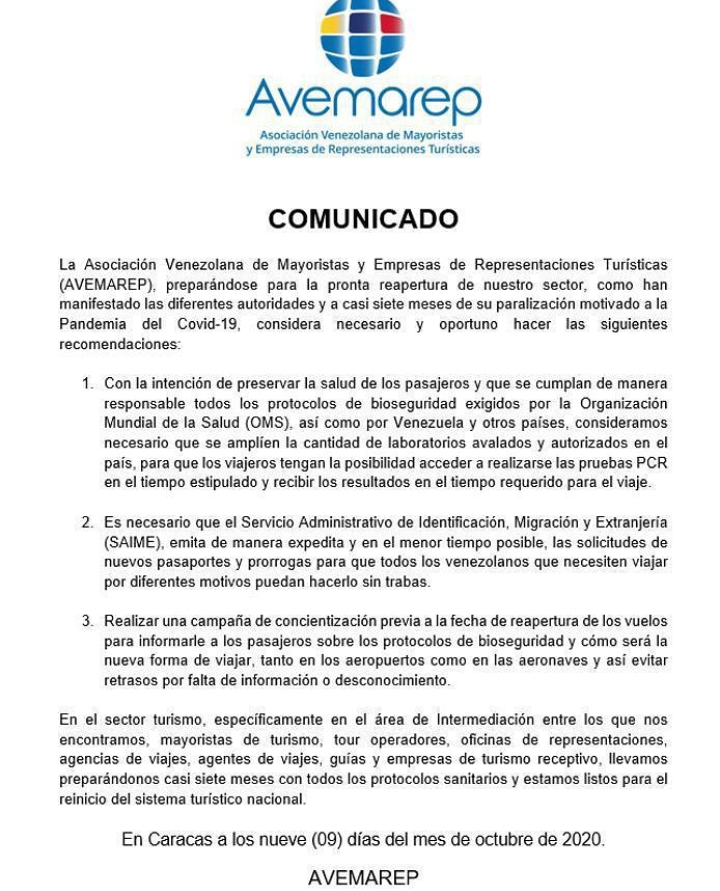 AVEMAREP, Asociación Venezolana de Mayoristas y Empresas de Representaciones Turísticas, emitió un comunicado dónde aseveran que, de reapertura el sector turismo en todo el territorio nacional; las condiciones deben estar óptimas, sobre todo con respecto a los protocolos de bioseguridad en medio de la pandemia de coronavirus.