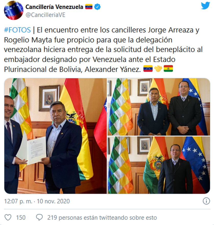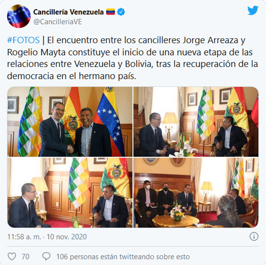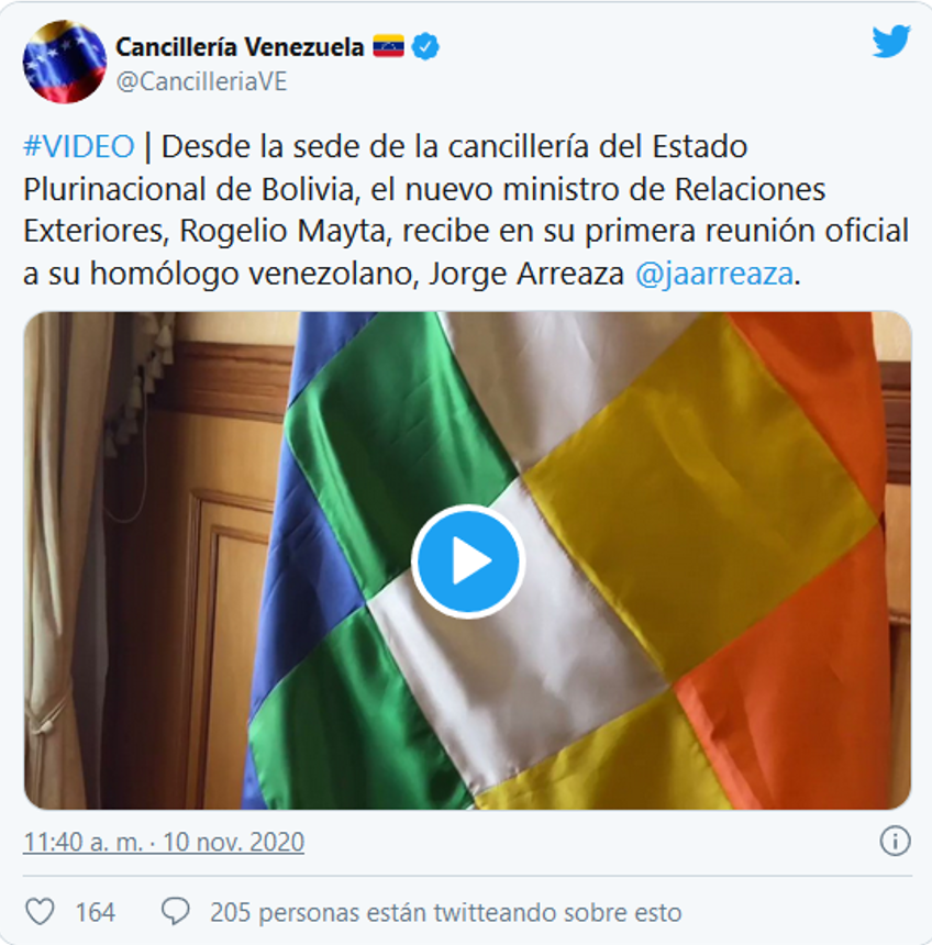 «Con gran orgullo informamos que hemos recuperado de manera pacífica lo que es del pueblo venezolano y boliviano y de los pueblos del mundo: la embajada de la República Bolivariana de Venezuela. Gracias al pueblo boliviano que le dio la victoria al MAS, a los movimientos sociales, a David Choquehuanca, a Luis Arce, a Evo Morales gracias a ellos estamos aquí retomando lo que es del pueblo», enfatizó Arreaza este lunes.