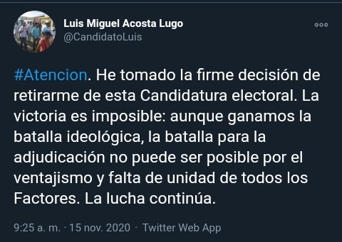 Acosta informó que tomó la decisión de retirarse ya que la victoria es imposible. “Aunque ganamos la batalla ideológica, la batalla para la adjudicación no puede ser posible por el ventajismo y la falta de unidad de todos los factores. La lucha continua” dijo el joven político por la red social twitter.