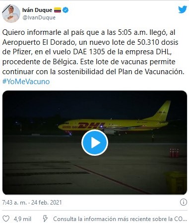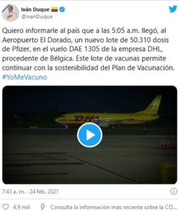 Duque informó por medio de su cuenta Twitter en la que colgó un vídeo del avión de la empresa de encomiendas a nivel internacional DHL con el suministro que generará la continuación del plan de vacunación en el país vecino.
