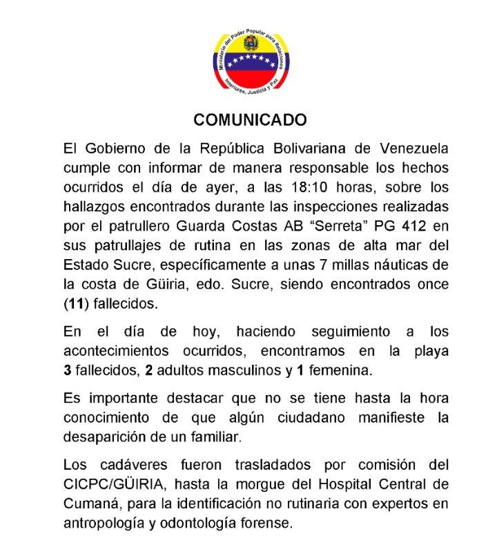 Aunado a esto notificó que los cadáveres ya fueron trasladados por las autoridades del Cuerpo de Investigaciones Científicas, Penales y Criminalísticas (Cicpc) de Güira a la Morgue del Hospital Central de Cumaná.