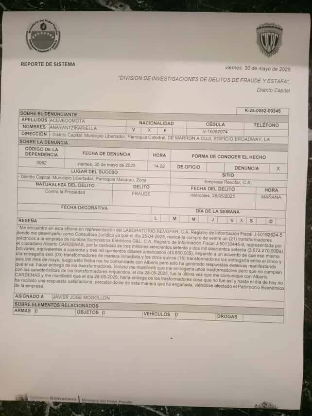 El Complejo Industrial Farmacéutico Revofar interpuso denuncia ante el C.I.C.P.C, el pasado 30/05/2025 contra Suministros G&L, C.A. y su representante Alberto Cárdenas por estafa calificada.