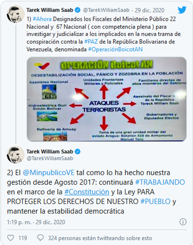 Tarek William Saab fiscal gereneral de la República este martes 29 de diciembre informó que el Ministerio Público designó a dos fiscales para investigar la denominada «Operación Boicot», que está vinculada con una «trama conspirativa para desestabilizar el país desde la Asamblea Nacional».