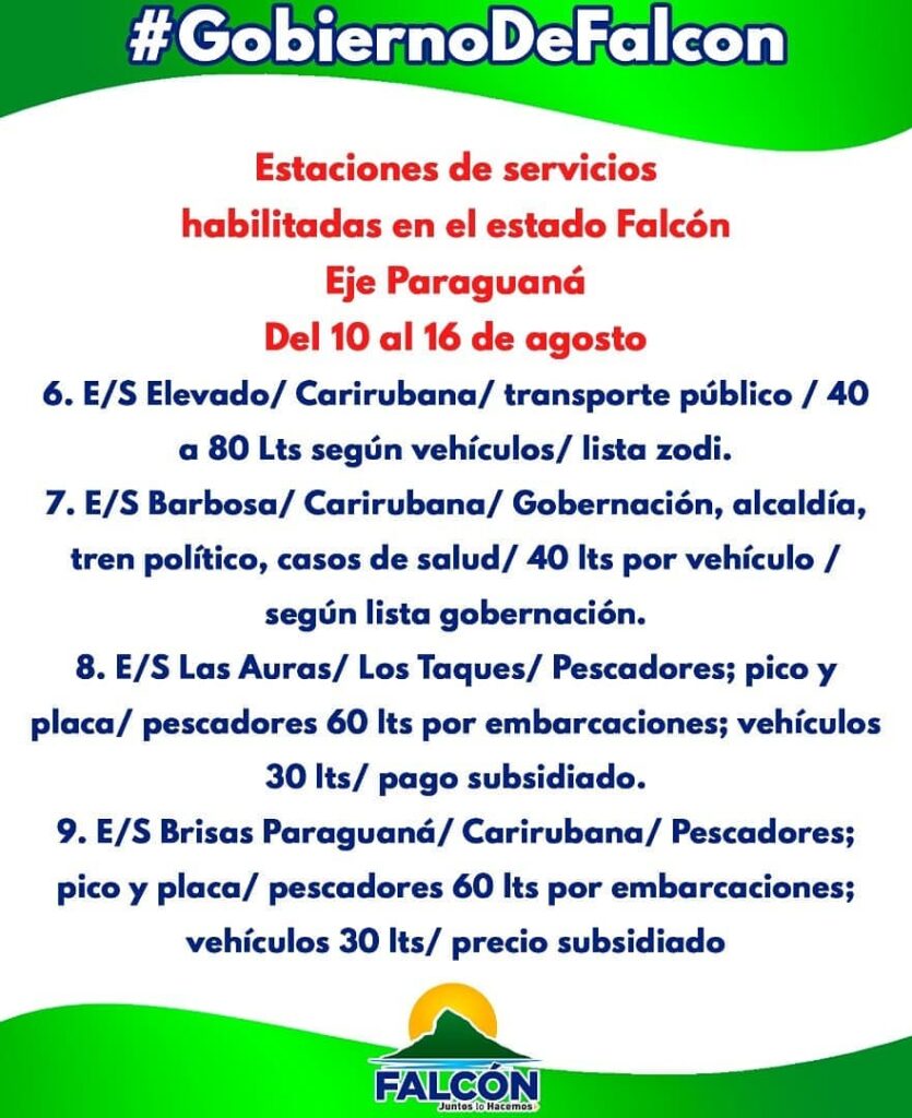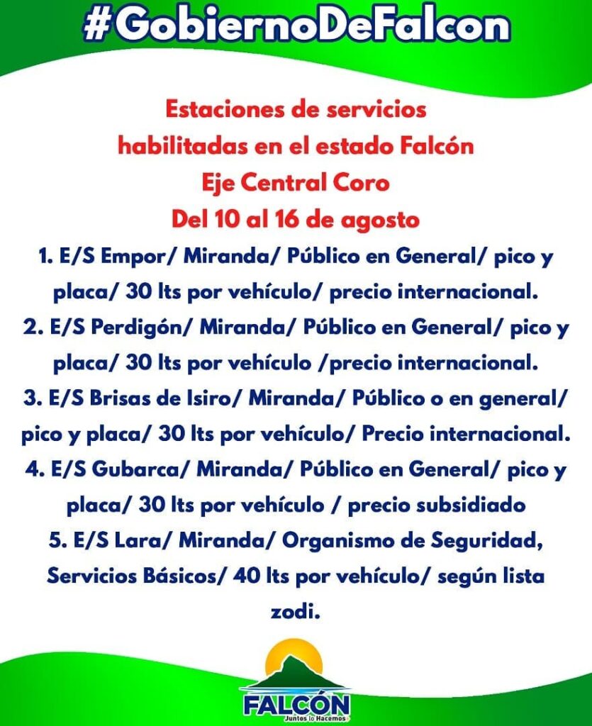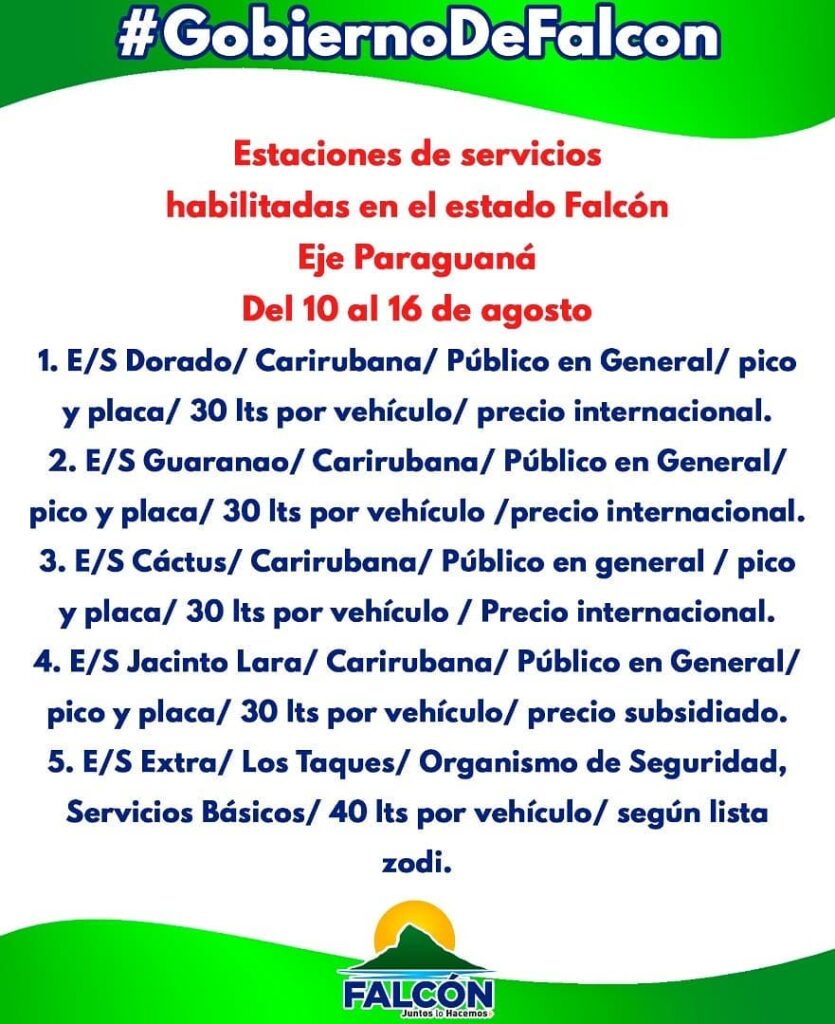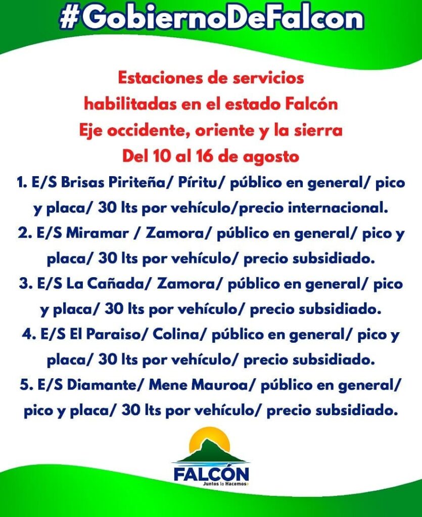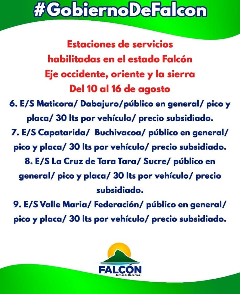 El comunicado emitido a través de la cuenta de instagram de la gobernación del estado Falcón, señala que estas estaciones estarán operativas entre el 10 y el 16 de agosto.