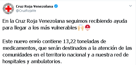 “En la Cruz Roja Venezolana seguimos recibiendo ayuda para llegar a los más vulnerables. Este nuevo envío contiene 13,22 toneladas de medicamentos, que serán destinados a la atención de las comunidades en el territorio nacional y a nuestra red de hospitales y ambulatorios”, escribió la Cruz Roja Venezolana en su cuenta en la red social Twitter.