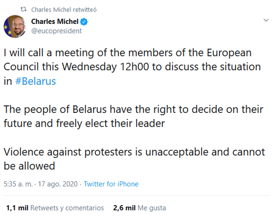 Charles Michel presidente del Consejo Europeo este lunes realizó la convocatoria a una cumbre de lideres con vistas a debatir la situación que se esta viviendo en Bielorrusia. Todo esto, tras las elecciones de la semana pasada, donde fue reelegido Lukashenko pero con un triunfo ensombrecido por las protestas en su contra acusándole de fraude electoral.