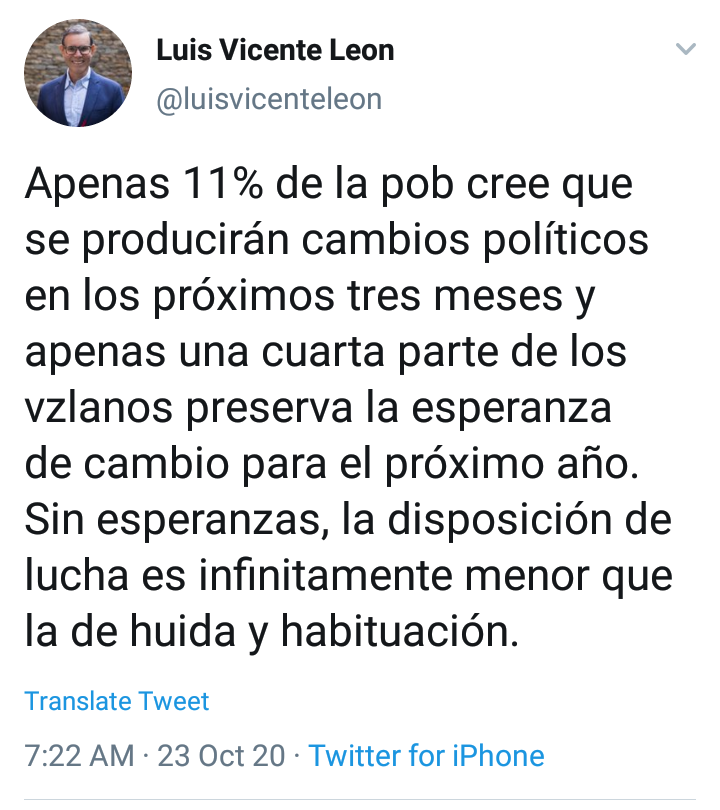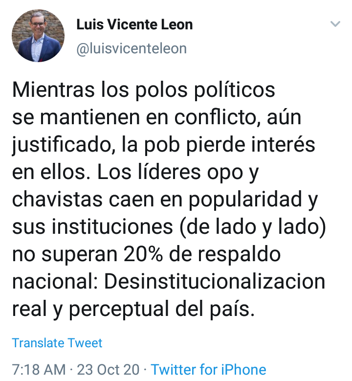Basado en esto, aseveró que los líderes de la oposición y los del oficialismo «caen en popularidad y sus instituciones (de lado y lado) no superan 20% de respaldo nacional: Desinstitucionalizacion real y perceptual del país”.