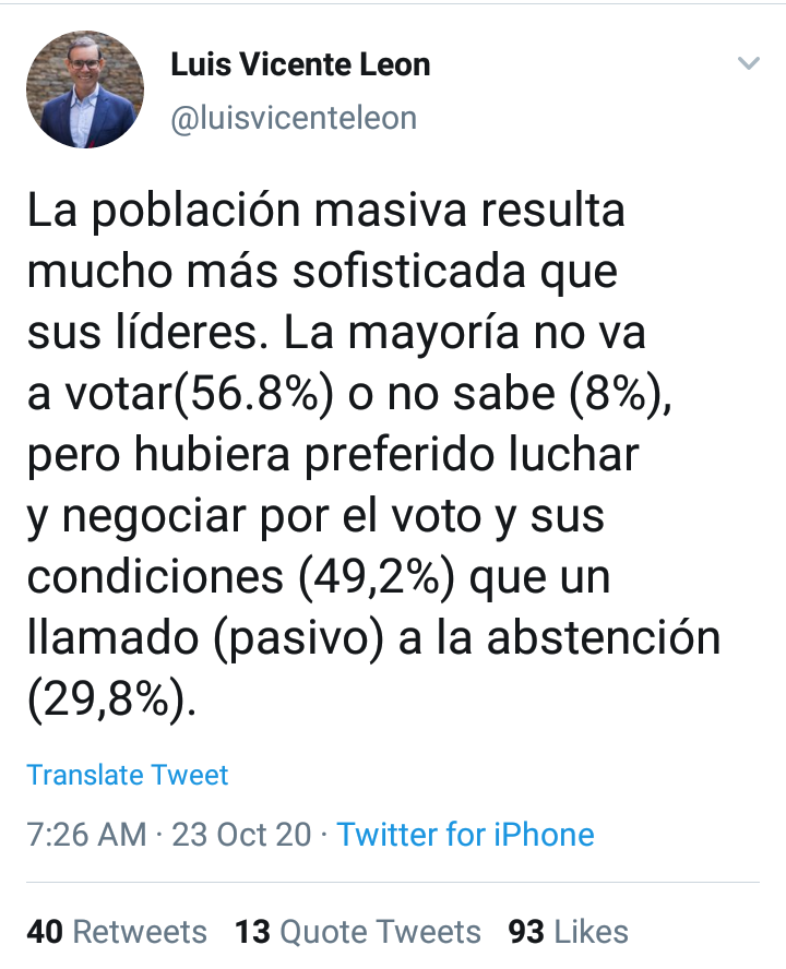 León indicó que ,la tendencia del venezolano en cuanto al sufragio se inclina a “no va a votar (56.8%) o no sabe (8%), pero hubiera preferido luchar y negociar por el voto y sus condiciones (49,2%) que un llamado (pasivo) a la abstención (29,8%)”.