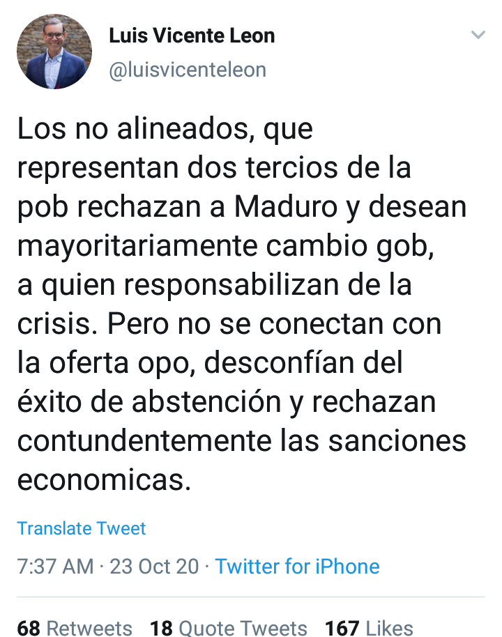 Por último destacó que, los venezolanos no alineados, “ representan dos tercios de la población, rechazan a Maduro y desean mayoritariamente cambio de Gobierno, a quien responsabilizan de la crisis. Pero no se conectan con la oferta de la oposición, desconfían del éxito de abstención y rechazan contundentemente las sanciones economicas”.