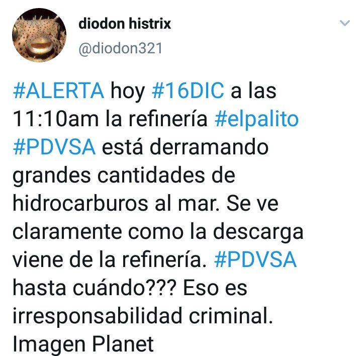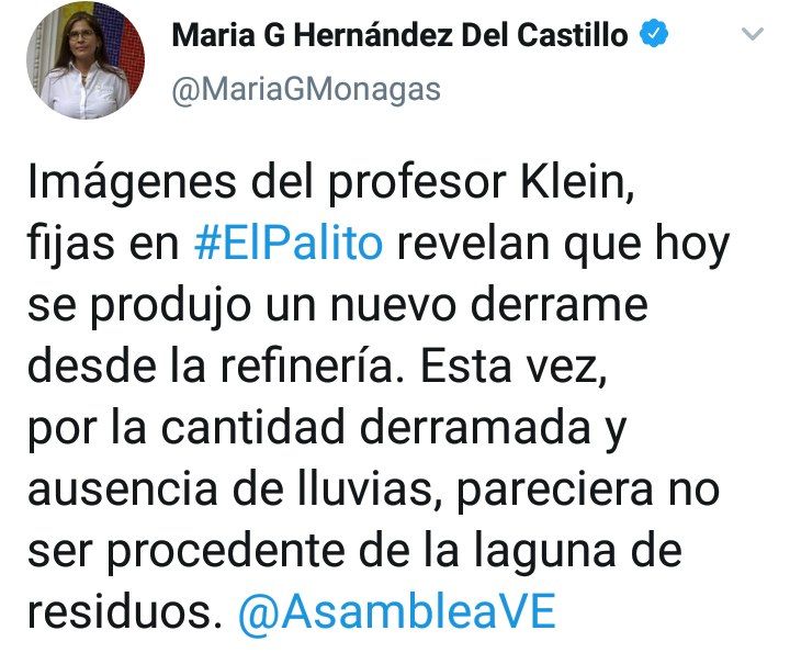 “El profesor Klein compartió fotos que revelan que hoy se produjo un nuevo derrame desde la refinería El Palito. Esta vez, por la cantidad derramada y ausencia de lluvias. Pareciera no ser procedente de la laguna de residuos”.