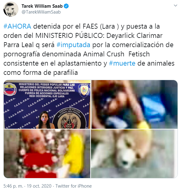 Saab detalló en Twitter que Deyarlick Clarimar Parra Leal “será imputada por la comercialización de pornografía denominada Animal Crush Fetish, consistente en el aplastamiento y muerte de animales como forma de parafilia”.