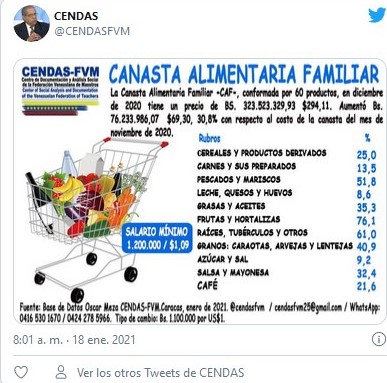 A través de Twitter CENDAS Centro de Documentación y Análisis Social de la Federación Venezolana de Maestros señaló que el costo de la Canasta Alimentaria Familiar del mes de diciembre alcanzó los 294,11 dólares equivalente a Bs. 323.523.329, 93