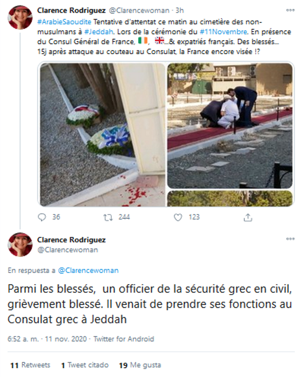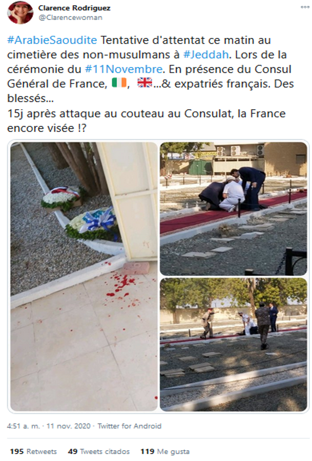 “La ceremonia anual que conmemora el final de la Primera Guerra Mundial en el cementerio no musulmán en Jeddah, a la que asistieron varios consulados, incluido el de Francia, fue el objetivo de un ataque con artefactos explosivos improvisados esta mañana, que hirió a varias personas”, informó la Cancillería de Francia.