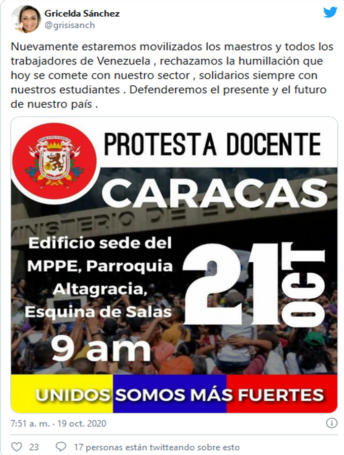 Los maestros y trabajadores en todo el territorio nacional hicieron un llamado para regresar a las calles. La manifestación esta vez, está pautada para el 21 de octubre, el motivo de la movilización sería el rechazo a la «humillación» con respecto al sector educativo, en distintas ciudades del país.
