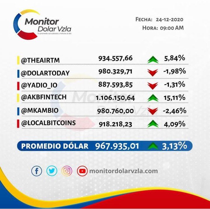 La divisa norteamericana se ubicó en la mañana de este 24 de diciembre en Bs. 967.935,01 con un alza de 3,13 puntos porcentuales respectivamente.