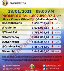 La jornada de este jueves 28 de enero el dólar se cotizó en Bs. 1.807.890, 97 lo que representa un descenso del 2,65% respectivamente.