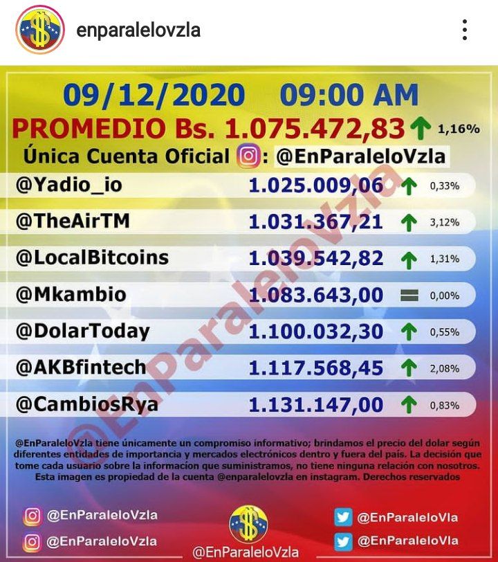 La moneda estadounidense se ubicó este 9 de diciembre en Bs. 1.075.472,83 lo que se traduce en un alza de 1,16 puntos porcentuales respectivamente.