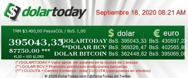 La cotización de la divisa norteamericana este viernes 18 de septiembre en la cuenta @dolartoday se ubica en Bs. 395043,33 con tendencia alcista.