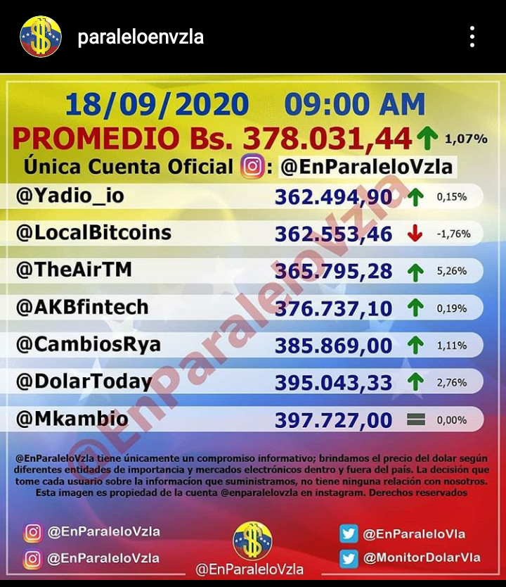 Aunado a esto, en la cuenta @enparalelovenezuela la divisa se cotiza en Bs. 378.031,44 también con tendencia alcista de 1,07% a 3.988,24.
