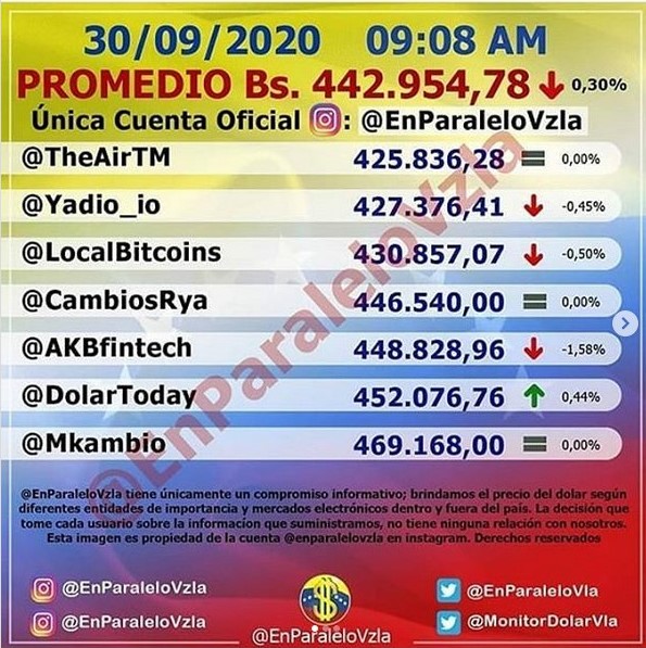 Los puntos porcentuales de la cotización en la moneda norteamericana se traducen en Bs. 1.332,56 y representa un mínima diferencia al cierre del martes 29 de septiembre donde se cerró con la divisa estadounidense en Bs. 444.287,34.