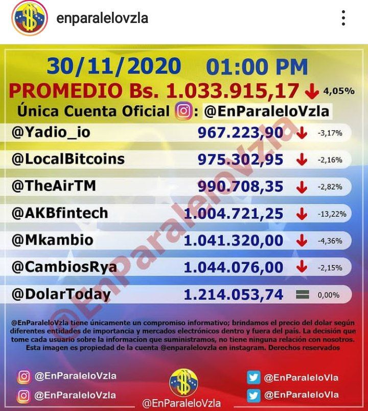 Este lunes 30 de noviembre el dólar cierra la jornada en Bs. 1.033.915,17 lo que significa un alza de 4,05 puntos porcentuales respectivamente.