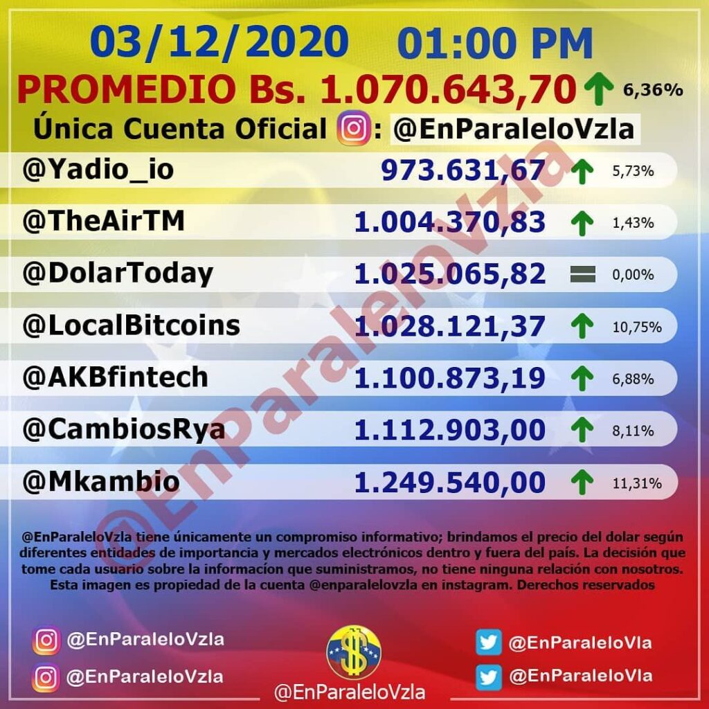 La moneda norteamericana se ubicó en el cierre de este jueves 3 de diciembre en Bs.1.070.643,70 representando un incremento de 6,36 puntos porcentuales respectivamente.