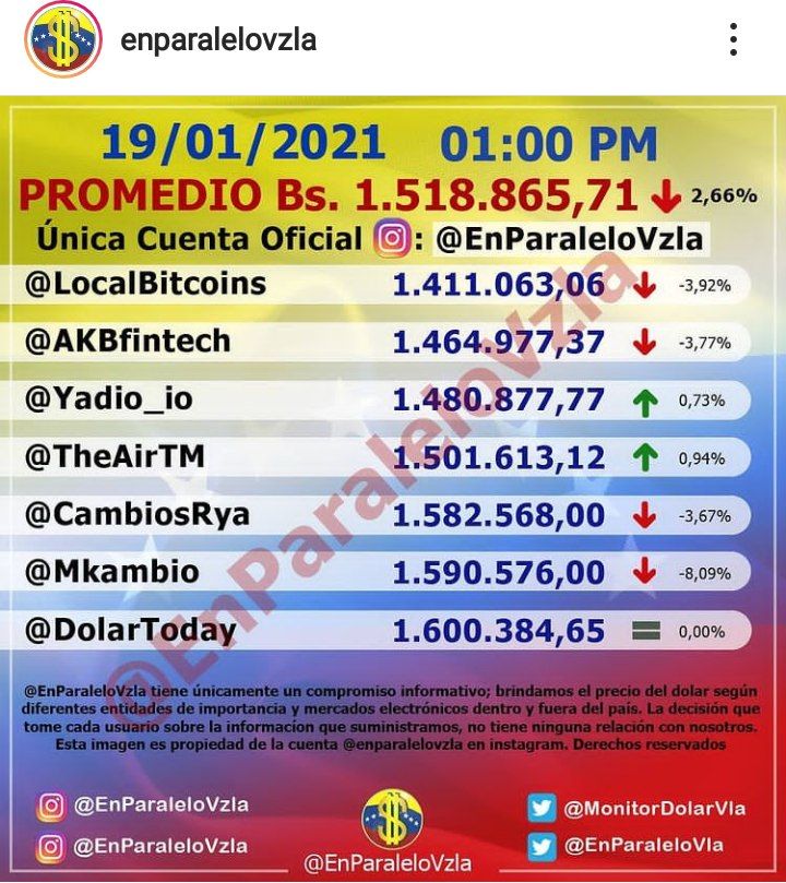 La moneda extranjera se ubicó en la tarde de este martes 19 de enero en Bs. 1.5189.865,71, lo que significa un descenso de 2,66 puntos porcentuales respectivamente.