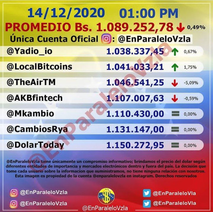 La moneda norteamericana en la tarde de este lunes 14 de diciembre se ubicó en Bs.1.089.252,78 significando un descenso de 0,49 puntos porcentuales respectivamente.