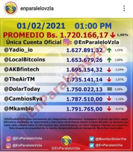 En la tarde de este 1 de feberero la moneda norteamericana se ubicó en Bs. 1.720.166,17 lo que significa una apreciación en puntos porcentuales de 1,00 respectivamente.