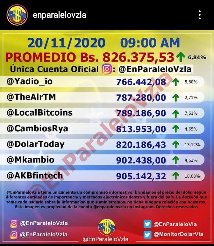 Este viernes 20 de noviembre la divisa norteamericana registró un alza de 6,48 puntos porcentuales, lo que significa Bs. 826.375,53 respectivamente.