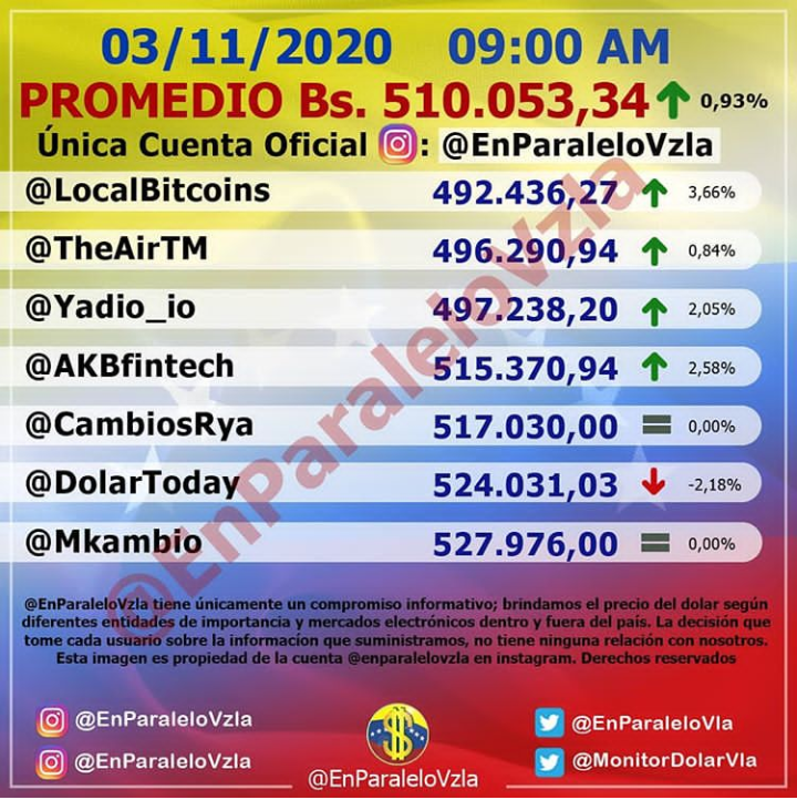 La jornada de este 3 de noviembre inicia con la divisa norteamericana en Bs. 510.053,34 que significa un alza de 0,93%.