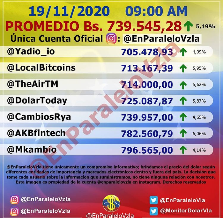 Este jueves 19 de noviembre, la moneda norteamericana se ubicó en Bs. 739.545,28 lo que representa 5,19 puntos porcentuales de crecimiento.