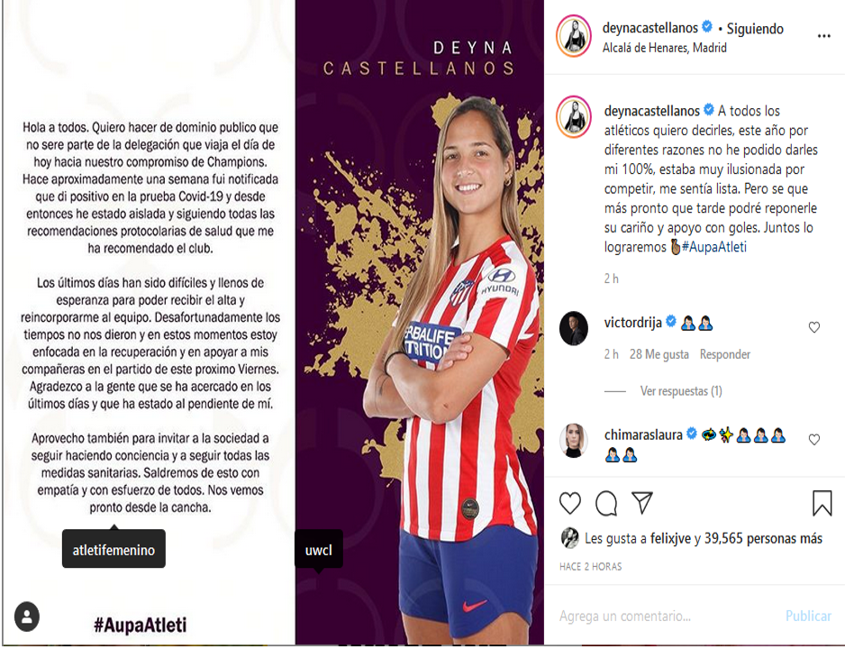 Deyna Castellanos, delantera venezolana del Atlético de Madrid, informó que dio positivo en covid-19, explicó que desde hace una semana fue diagnosticada y está siguiendo todas las recomendacionesen su tratamiento de salud.