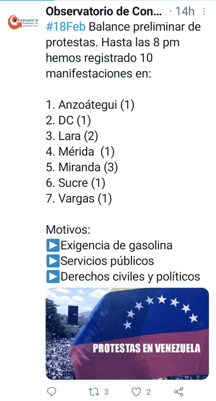 A través de su cuenta en la red social Twitter, esta Organización No Gubernamental (ONG) dio a conocer los estados en los que se efectuaron las protestas, en su mayoría por exigencias de gasolina, servicios públicos, derechos civiles y políticos.