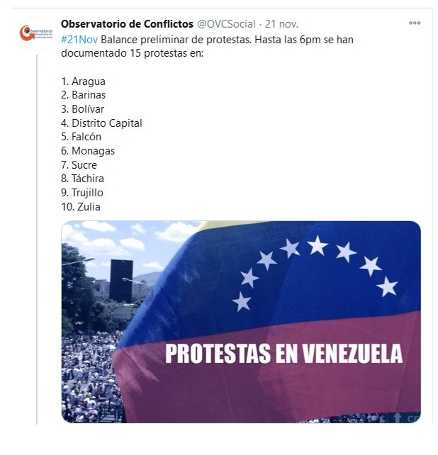 Un total de 15 protestas se registraron en Venezuela, durante la jornada del pasado 21 de noviembre, según el reporte del Observatorio Venezolano de Conflictividad Social (OVCS).