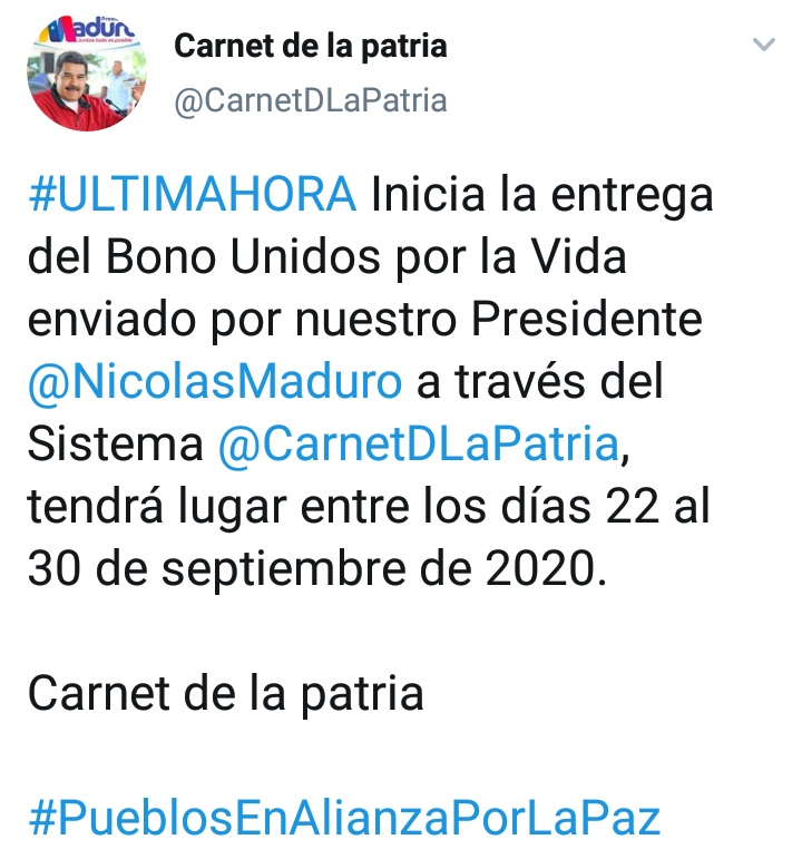 El martes 22 de septiembre comenzó la asignación «Unidos por la Vida», que se realizará entre los días 22 al 30 de septiembre, la entrega del mismo se realizará de manera directa y gradual.