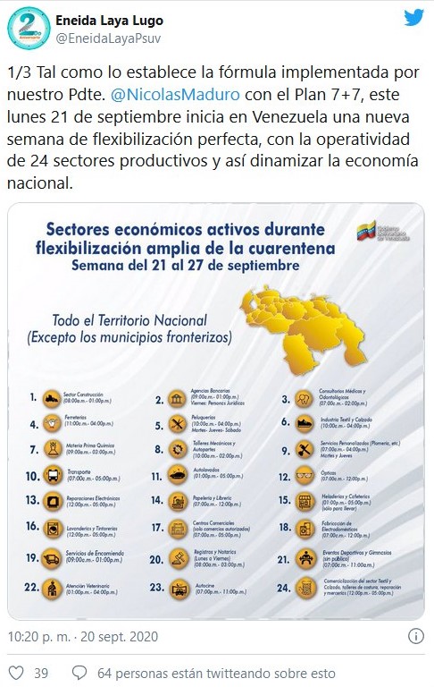De igual forma Laya Lugo aseveró que, los establecimientos están en los 24 sectores productivos en los Centros Comerciales, y dentro del horario tipificado pueden aperturar “Se mantienen 24 sectores económicos dentro del esquema de flexibilización”, sentenció.
