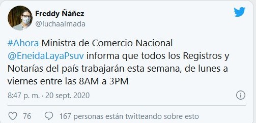 Eneida Laya ministra del poder Popular para el Comercio Nacional comunicó que los Registros y Notarías del país trabajarán en la semana de flexibilización 7+7 desde las 8:00 de la mañana hasta las 3:00 de la tarde. Laya indicó que este horario se estableció con el propósito de que las empresas (pequeñas y medianas) PYMES puedan iniciar sus procesos de registro.