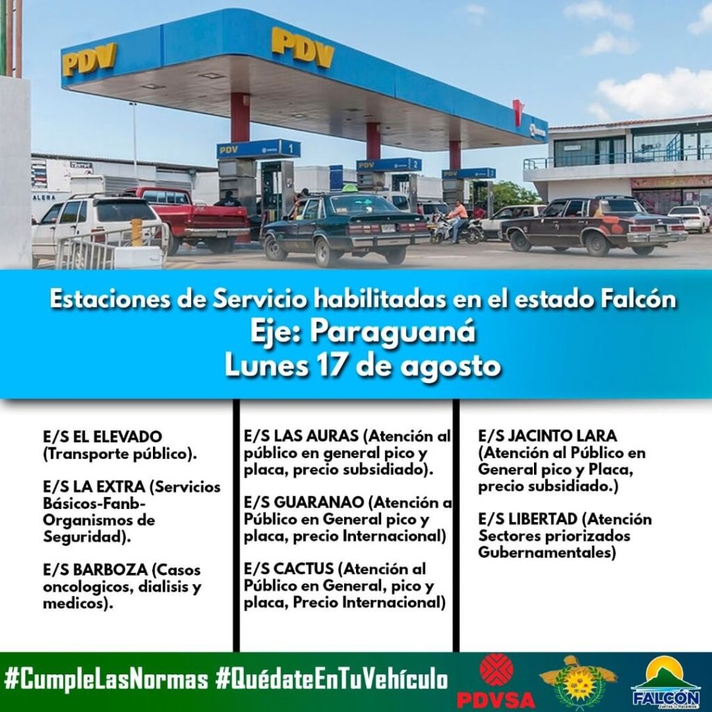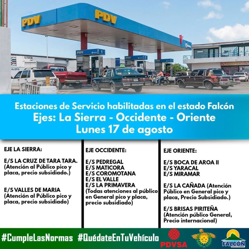 Según cronograma emitido por el gobierno regional a continuación se detallan las estaciones de servicio que estarán funcionamiento este lunes en los diferentes ejes del estado Falcón: